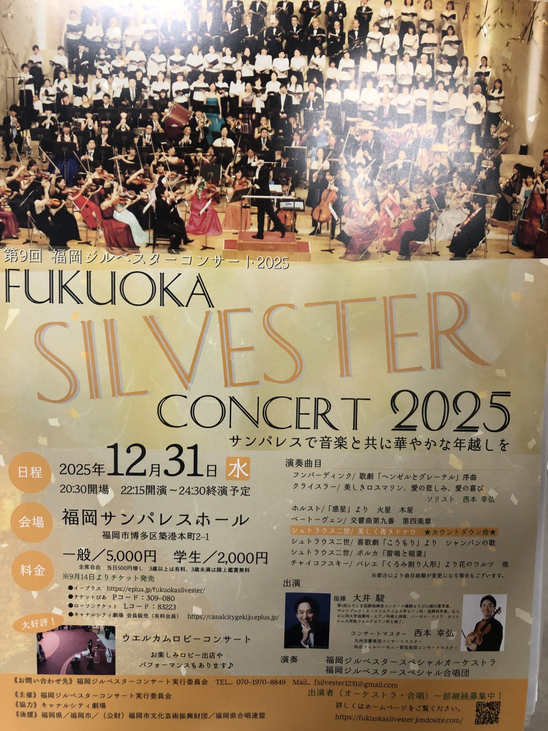 年末に福岡サンパレスで開催される年越しクラシックコンサートの広告チラシが出来たので数枚もらってきました。合唱団員として参加するので無料チケットを2枚、10月中旬あたりに交付されます。家族は自分以外に音楽にはまったく興味がないので、チケット2枚をどうするか考えています。ピアノ教室に渡すか、知人のプロジャズピアニストの先生にあげるか迷っています。